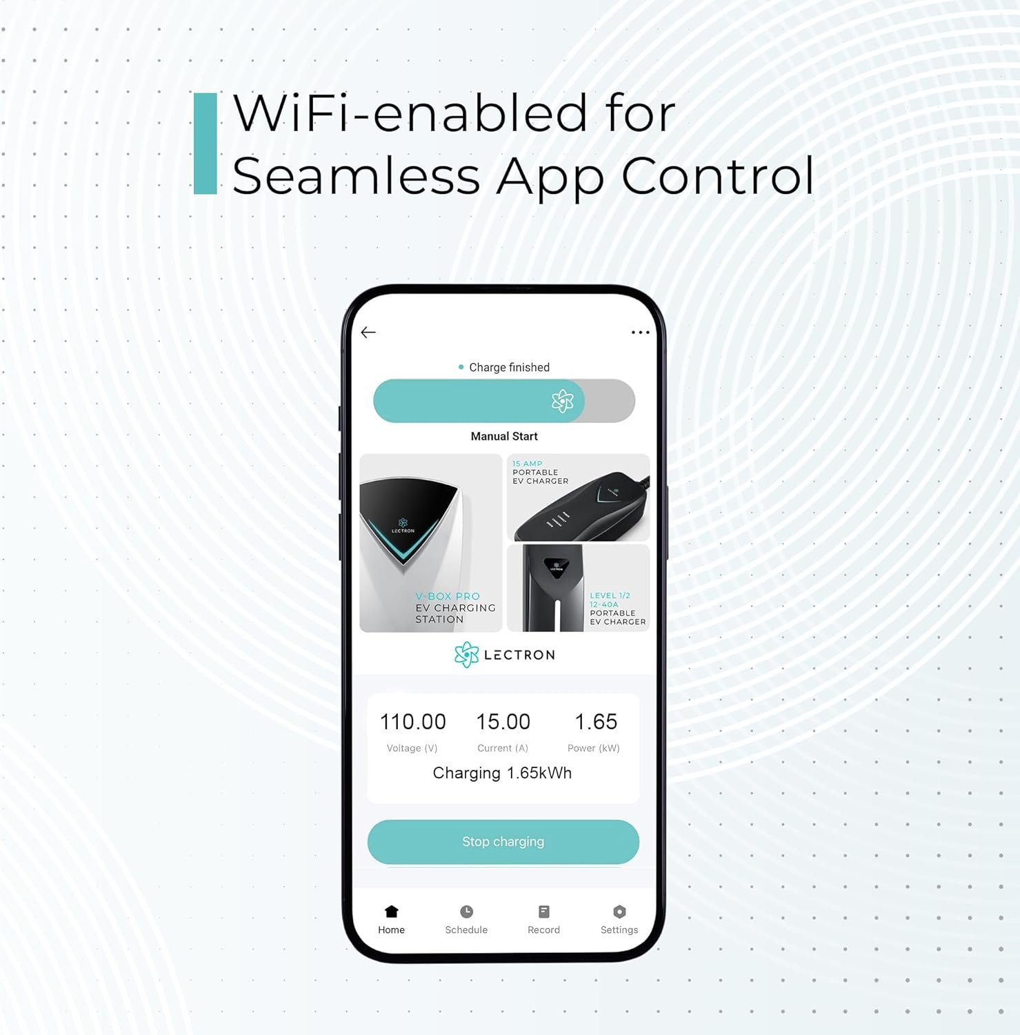 The Lectron Level 1 WiFi-enabled EV charger is a compact and portable solution for daily charging needs. Designed with a 15 amp output and NEMA 5 15 plug, it easily connects to standard household outlets and adds around 40 to 50 miles of range overnight. Control and monitor charging through the Lectron app for added convenience.